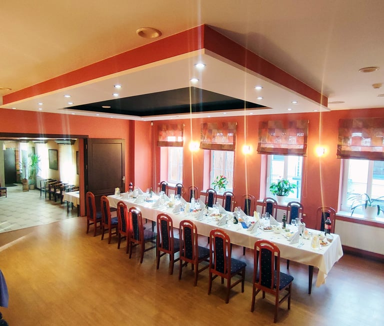 Pobūvių salė talpina iki 50 svečių. O kaina gali svyruoti ir priklausyti nuo jūsų poreikių, preliminari kaina vienam asmeniui nuo 40 €.